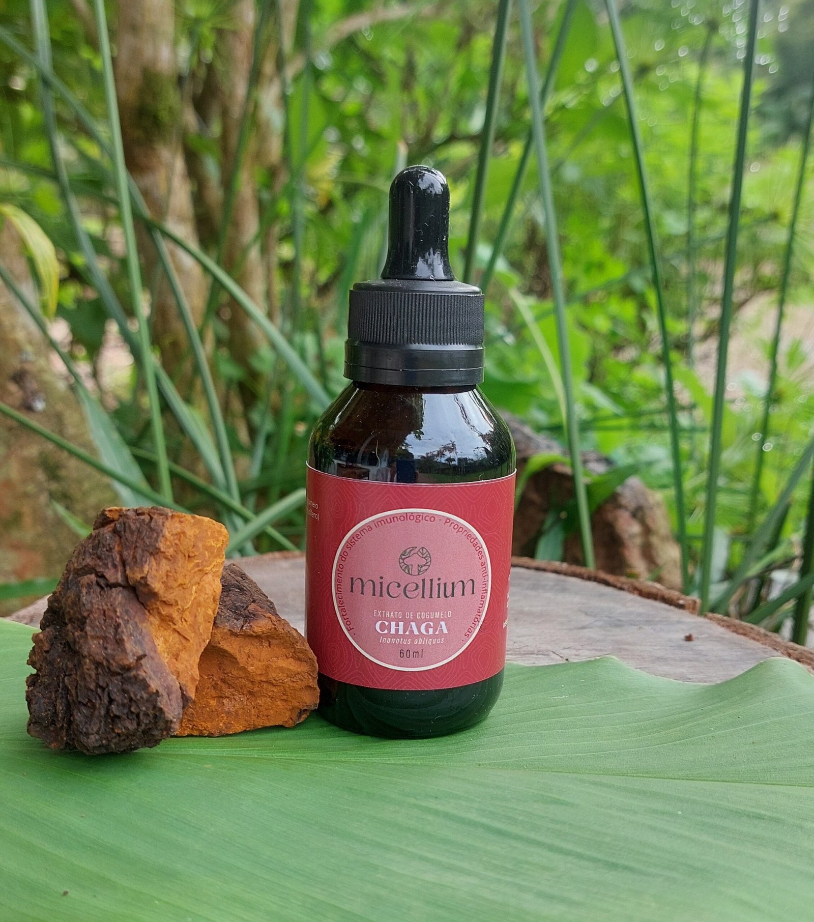Tintura feita a partir do corpo frutífero do cogumelo Chaga, em solução hidroalcoólica (40 a 50% de álcool).